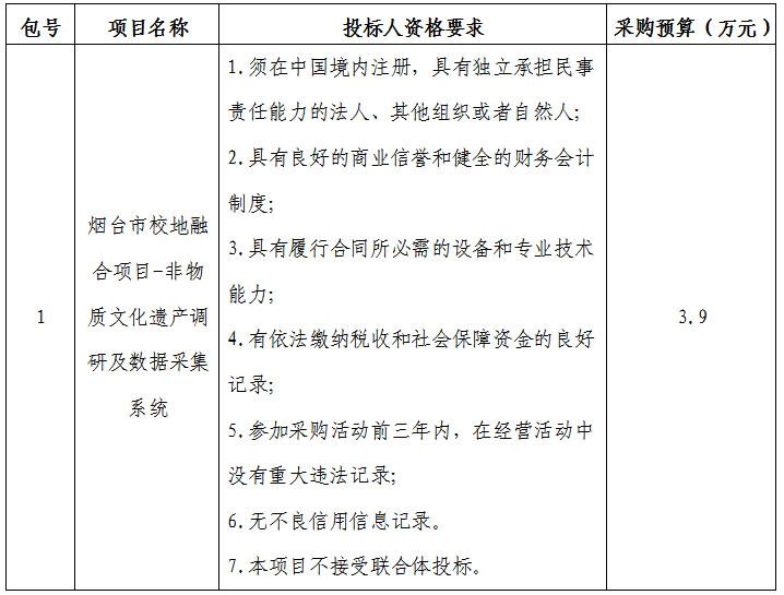 采购内容:烟台市校地融合项目-非物质文化遗产调研及数据采集系统;本项目划分一个包。包号情况: