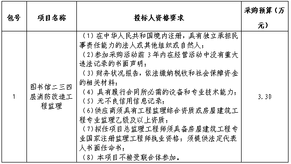 采购内容:图书馆二三四层消防改造工程监理;本项目划分一个包;