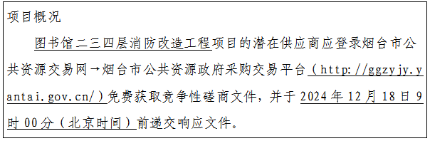 采购需求:本项目为山东商务职业学院图书馆二三四层消防改造工程,主要建设内容为图书馆二三四层消防改造施工,面积约为13158㎡。