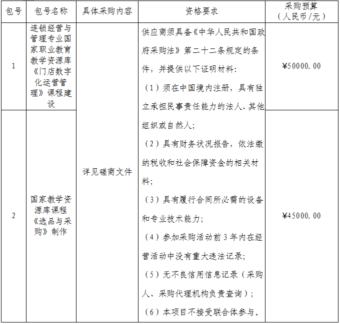 四、采购项目分包情况:山东商务职业学院课程资源制作相关服务,本项目共划分为两个包,第一包:连锁经营与管理专业国家职业教育教学资源库《门店数字化运营管理》课程建设;第二包:国家教学资源库课程《选品与采购》制作。