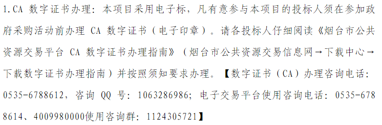 3.下载招标文件:在投标截止时间前,潜在投标人均可通过烟台市公共资源政府采购交易平台凭数字证书(CA)免费下载本项目的电子招标文件(文件格式.YTZF)获得招标文件。