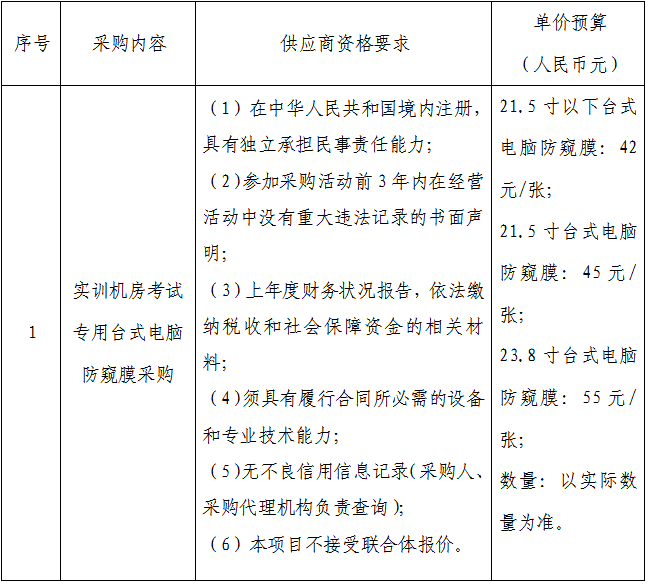 一、采购项目名称:实训机房考试专用台式电脑防窥膜采购