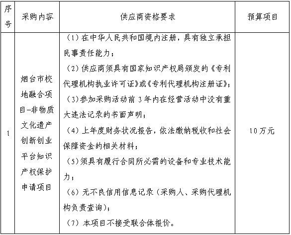一、采购项目名称:烟台市校地融合项目—非物质文化遗产创新创业平台知识产权保护申请项目
