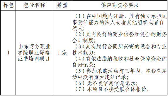 二、采购项目名称:山东商务职业学院职业资格证书培训项目