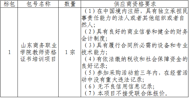 二、采购项目名称:山东商务职业学院教师资格证书培训项目