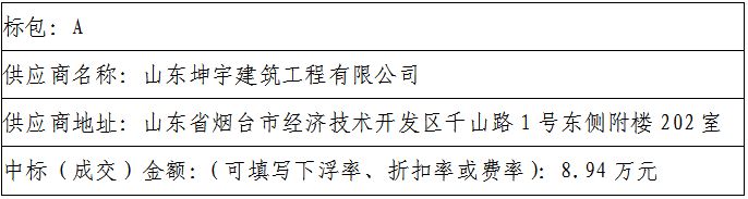 标包A:山东坤宇建筑工程有限公司(80.5、85.0、86.0)、烟台市木槿装饰工程有限公司(75.47、77.97、84.47)、青岛明铂空间装饰有限公司(75.54、77.04、78.54)