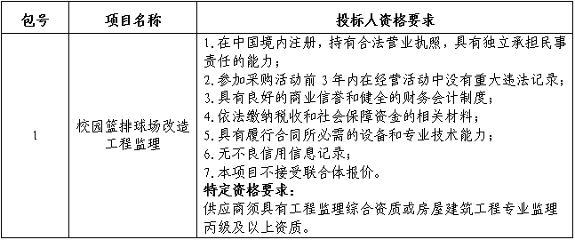 采购内容:校园篮排球场改造工程监理;本项目划分一个包;