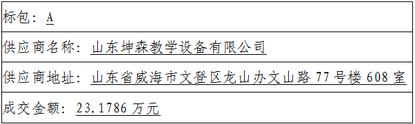 标包A:山东坤森教学设备有限公司(86.0、91.0、95.0)、烟台舒博装饰工程有限公司(85.97、89.97、91.97)、威海金元素教育装备有限公司(73.22、75.22、82.22)