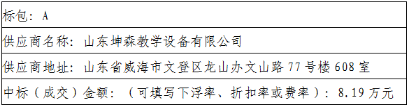 标包A:山东坤森教学设备有限公司(98.0、98.0、100.0)、威海金元素教育装备有限公司(95.75、97.75、99.75)、山东耀翔信息科技有限公司(93.64、95.64、97.64)