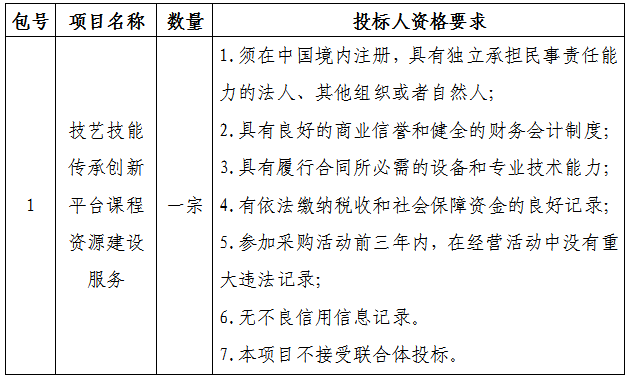 采购内容:技艺技能传承创新平台课程资源建设服务;本项目划分一个包;