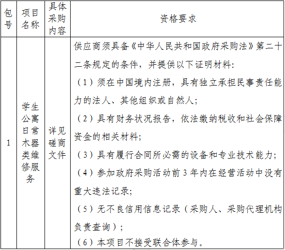 四、采购项目分包情况:学生公寓日常木器类维修等相关服务,本项目划分为1个包。