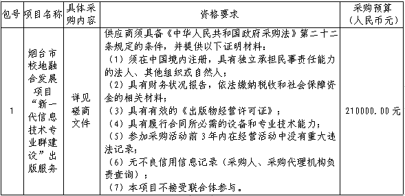 四、采购项目分包情况:烟台市校地融合发展项目“新一代信息技术专业群建设”出版相关服务;本项目划分为1个包。